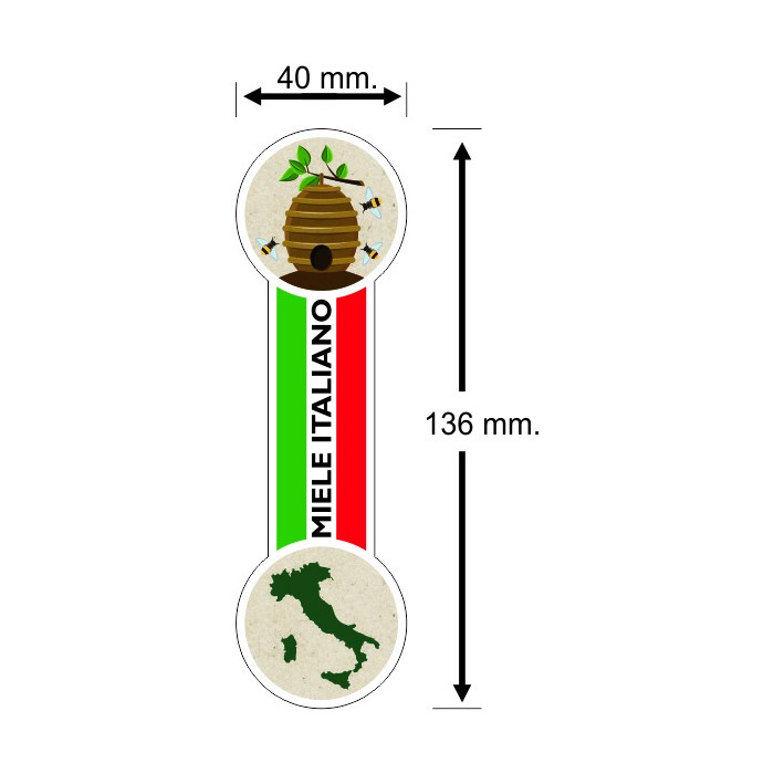 Etichette adesive “Sigillo Miele”. Formato: 40 x 136 mm.. Bobine da 500 etichette in carta patinata. Anima da 40 mm.Costo Euro 6,45 + IVA a bobina da 500 etichette.